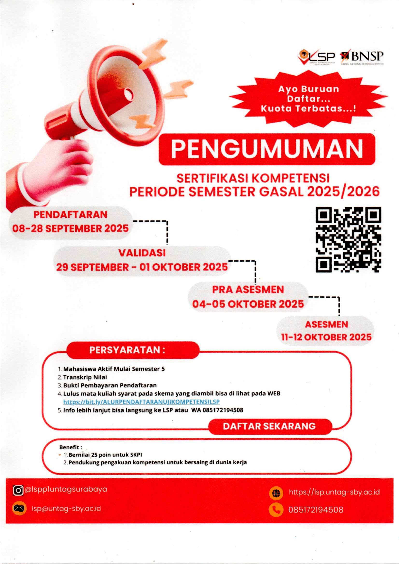 Telah dibuka Pendaftaran Uji Kompetensi bagi Mahasiswa Akhir oleh LSP P1 Untag Surabaya