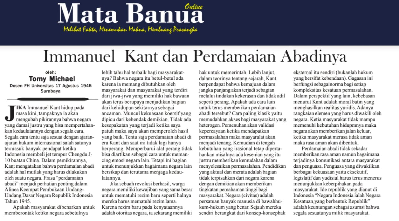Opini Dosen FH Untag Surabaya Dr. Tomy Michael, S.H., M.H., berjudul Immanuel Kant Dan Perdamaian Ab