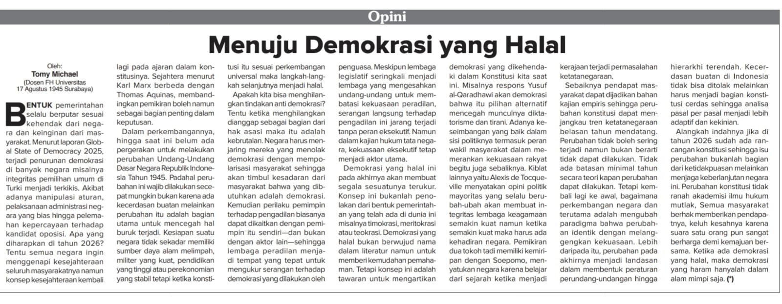 Opini Dosen FH, Dr. Tomy Michael, S.H., M.H., "Menuju Demokrasi Yang Halal"
