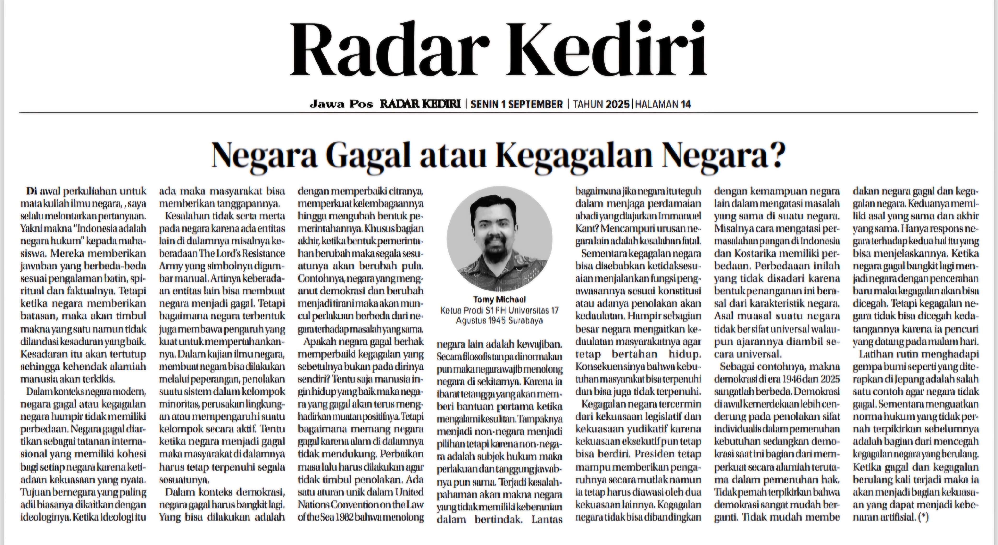 Opini Dosen Dr Tomy Michael berjudul Negara Gagal atau Kegagalan Negara?