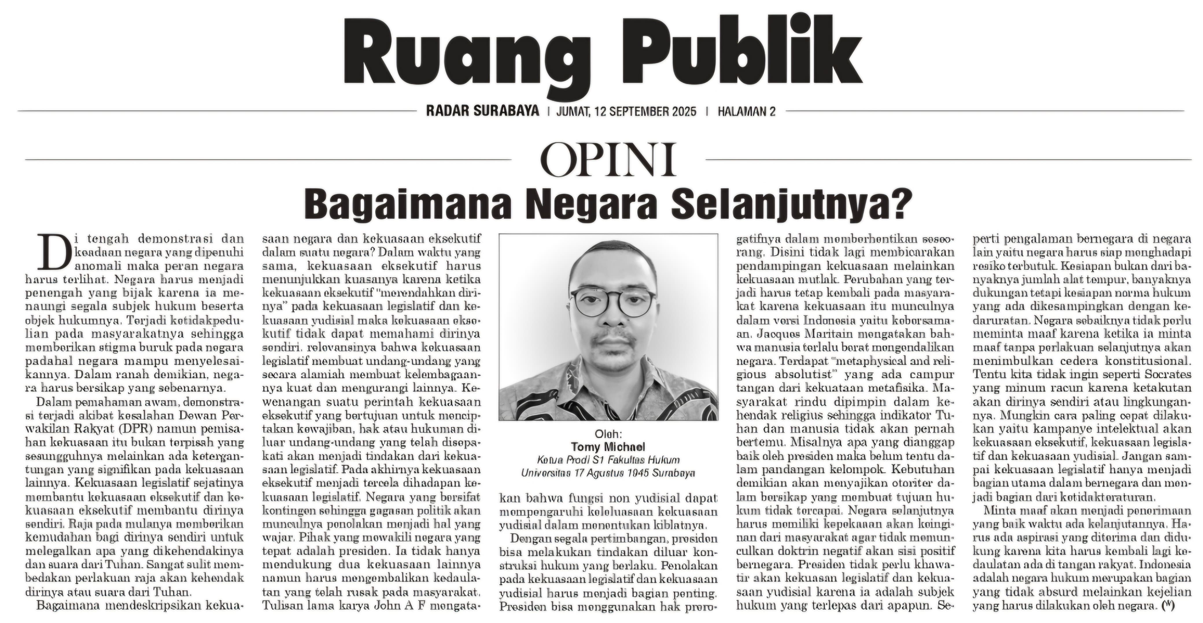 Opini Karya Dosen FH Dr Tomy Michael berjudul "Bagaimana Negara Selanjutnya?"