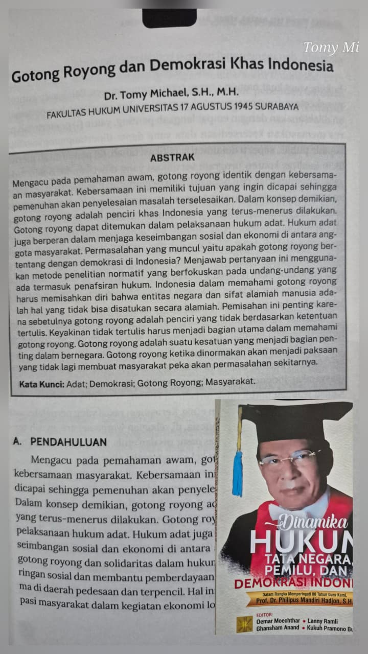 Karya Dr Tomy Michael dosen FH Untag Surabaya berjudul Gotong Royong Dan Demokrasi Khas Indonesia