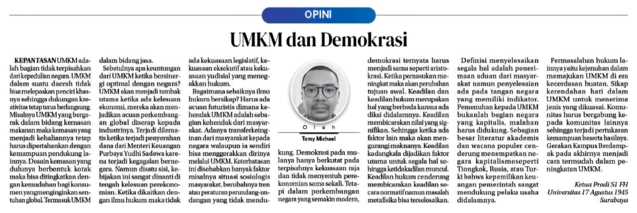 Opini Karya Dosen Dr Tomy Michael berjudul UMKM Dan Demokrasi dimuat pada Radar Semarang