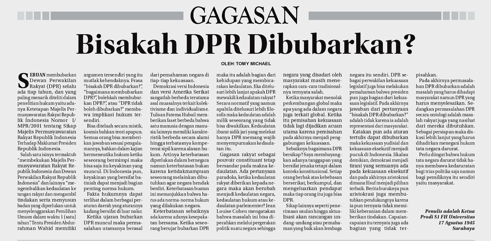 Opini Dosen Dr Tomy Michael, berjudul "Bisakah Gubernur dibubarkan?"
