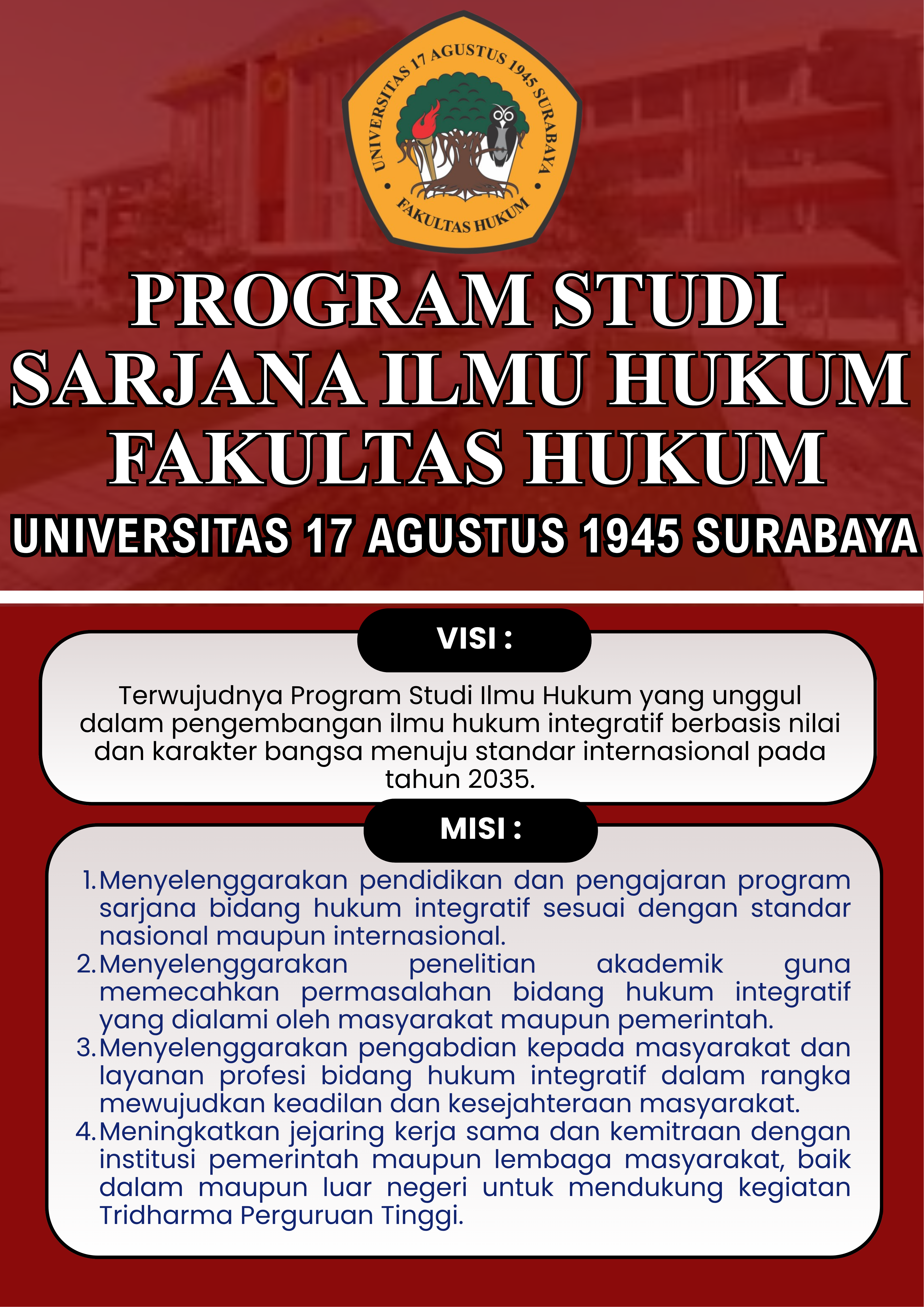 Terwujudnya Program Studi Ilmu Hukum yang unggul dalam pengembangan ilmu hukum integratif berbasis nilai dan karakter bangsa menuju standar internasional pada tahun 2035.